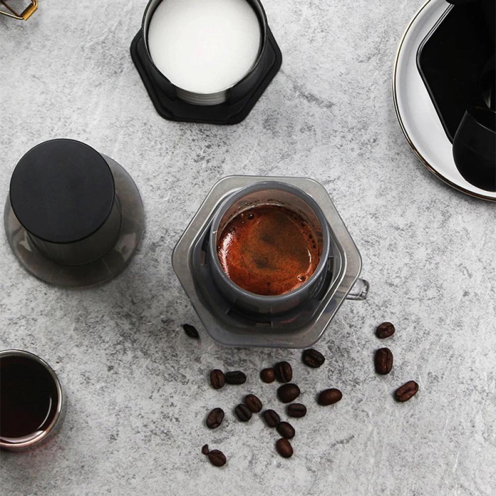 صانع قهوة اسبريسو محمول مع فرنش بريس، يتضمن أدوات باريستا حترافية التحضير. يأتي مع وعاء هواء للضغط بالتنقيط و350 قطعة من مرشحات الورق بحجم 64 مم، مما يضمن لك تحضير قهوة لذيذة وعالية الجودة في أي مكان بسهولة.